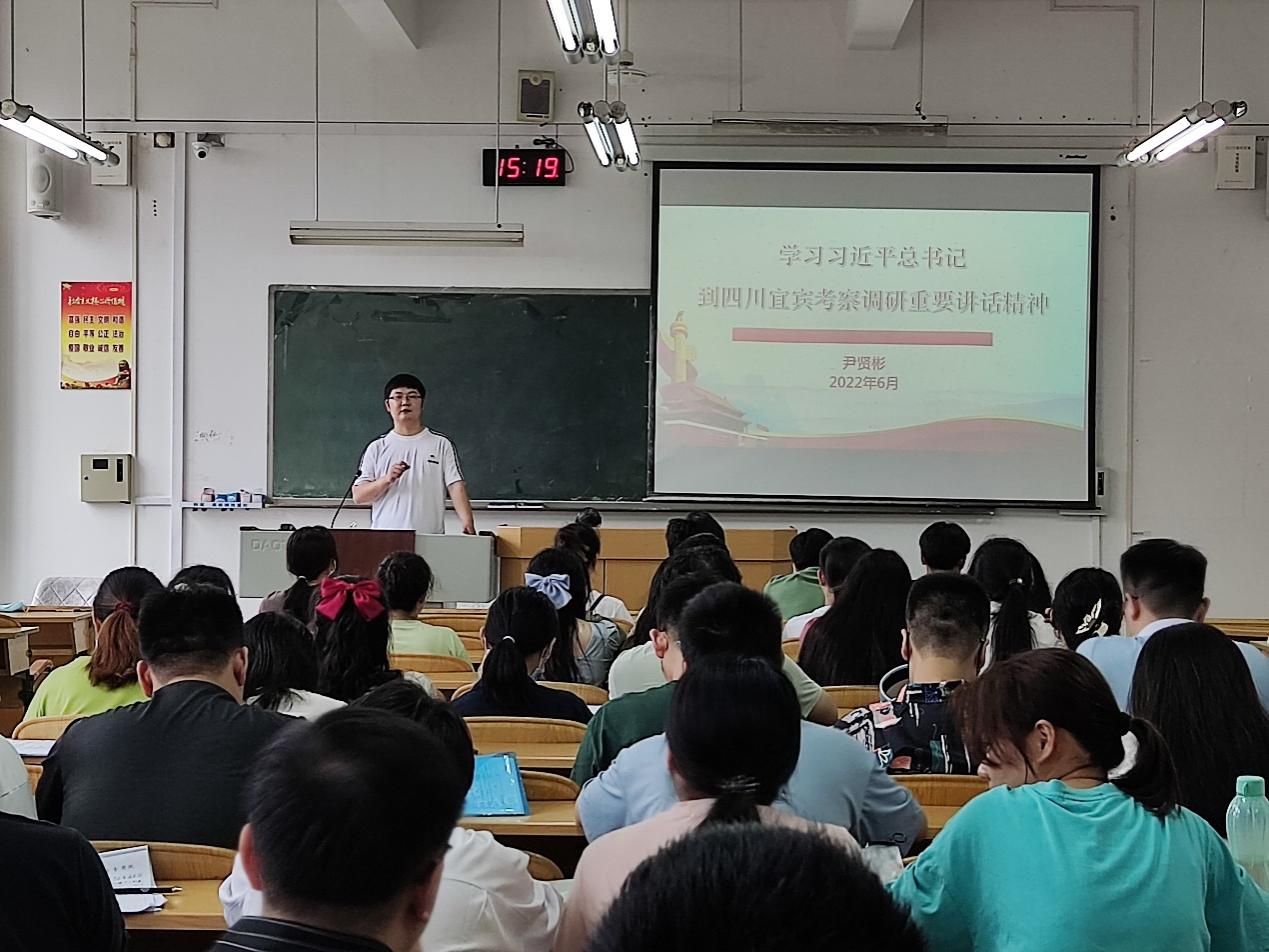 2022年6月9日,习近平总书记到四川宜宾考察调研引起了大家的强烈反响。2022年6月19日,研究生第三党支部在9108教室召开深入学习习近平总书记到四川宜宾考察调研重要讲话精神的党课。党课由支部书记尹贤彬老师讲解,全体党员以及入党积极分子参加。