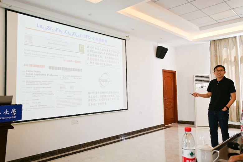 陈旻教授的报告则首先介绍了佛山市发展氢能源交通工具的现状,然后从工作原理、电解质及电极类型及其应用对燃料电池进行了整体的概述,以实际应用的角度出发对比了目前已经商业化应用的两款燃料电池“质子交换膜燃料电池”和“固体氧化物燃料电池”,并提出了发展固体氧化物燃料电池的优势及应用前景。陈旻教授还介绍了在钙钛矿阴极材料方面的工作,即通过同时调控钙钛矿结构(ABO3)的A位和B位来获得具有高稳定性和高催化活性的阴极材料La0.3Sr0.7Fe0.7Cr0.3O3-δ,目前该材料在市场上已经得到应用。陈旻教授提出的A位和B位同时调控钙钛矿材料的设计思路,为设计固态氧化物燃料电池阴极材料提供了重要思路。