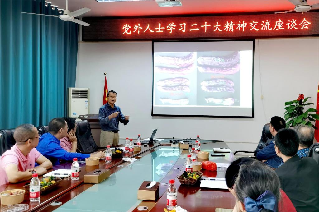会上,各党外人士代表热切交流了党的二十大精神学习心得。陆绍荣教授首先作了题为《科技服务基层助力乡村振兴——纳米硒生物微肥应用研究》的专题报告。他指出,只有深入基层、深入乡村开展调研,才能真正了解基层农业产业发展需求,才能真正使科研服务于地方经济。作为高校科研工作者,应着力提高自身科研水平和科研能力,提升农村科技创新力;积极利用“互联网+农业科技”,强化农业技术成果转化;加大农业科技人才培养力度,强化农业科技人才支撑。随后,与会代表们就生态发展、乡村振兴、立德树人、人才培养、科技创新、科教兴国、高等教育、文化自信等方面,结合自身研究领域进行了深入交流和热烈讨论。