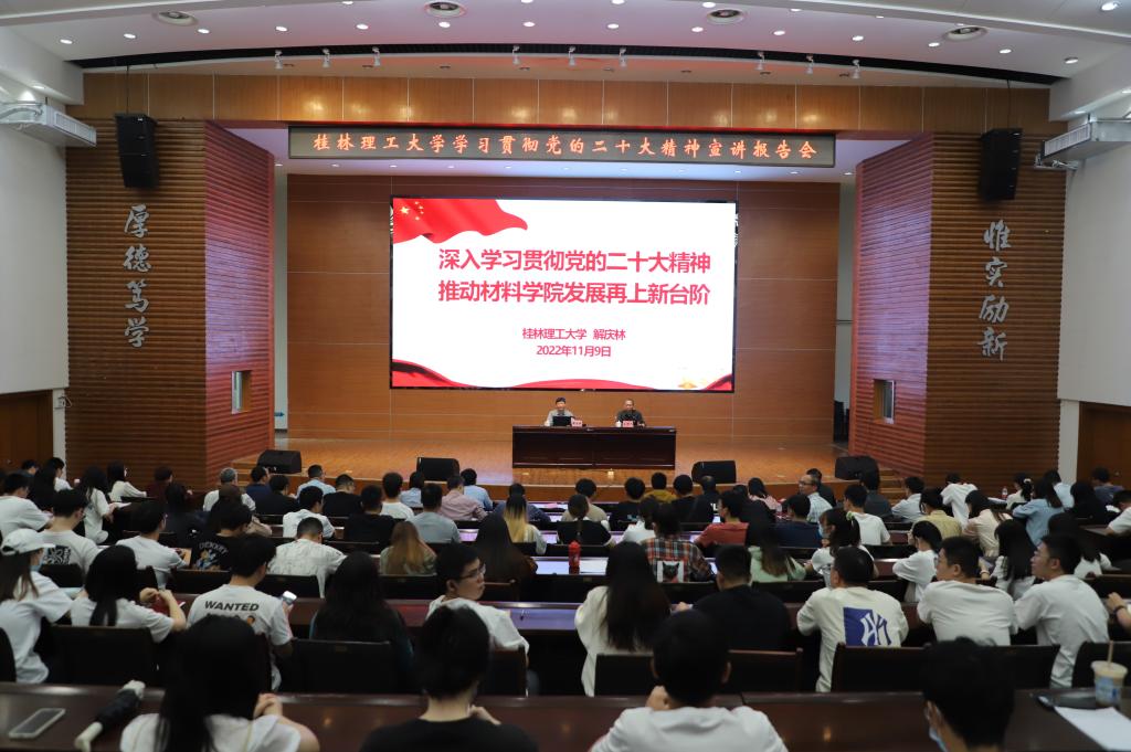解庆林同志指出,全体师生党员要深入领会二十大精神,贯彻落实党和国家的方针政策,抓住政策机遇,真抓实干做好三个方面工作:一是创新人才培养,为学校建设培养质量高、教学水平高、管理水平高、服务水平高的高水平理工大学提供强有力支撑。二是立足学院实际,以科研团队为依托,利用有限的资源集中力量办大事,推动学院发展再上新台阶。三是推进产教融合,抓实抓细广西有色金属新材料创新发展现代产业学院建设工作,聚焦科技领域前沿,把科研成果落到经济社会发展上,为地方经济社会发展作出应有的贡献。