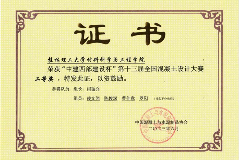 本次大赛来自混凝土材料研究、生产和施工企业,以及高校、科研院所的专业人员、在校学生,组成了企业组和院校组,共有63支队伍参加了本届大赛,其中院校队26支。经过仔细挑选,学院组建了以闫循乔同学为组长的竞赛团队。在学院赵艳荣副研究员和广西迈步新材料科技有限公司敬代焱工程师两位老师的悉心指导下,竞赛团队根据大赛高强轻质核心设计要求及绿色环保基本理念,反复打磨设计方案,精心制作样品,精挑细选各种工业原料和固废,多次优化制备工艺流程,最终得到了系列优化方案和优选作品,并荣获二等奖。
