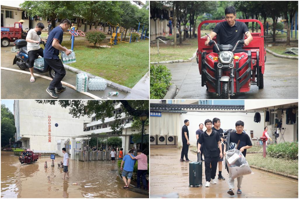 与此同时,学院党委积极协调各方资源,为学生提供必要的援助服务。面对水位不断上涨,梁军、周焕福当机立断,与学校学工部、基建处、资产处、后勤集团等部门通力合作,在学校体育馆三楼搭建临时安置点,迅速转移受灾宿舍学生,配合学校及时调配食品、饮用水、通电插排等一批救灾物资,确保学生基本生活需求得到满足。由于洪水造成供电设备损坏,导致停电,学院紧急调配采购140余个手电筒分发到停电受灾学生宿舍,并安排党员干部和志愿者24小时轮班值守,确保所有学生安全度汛。