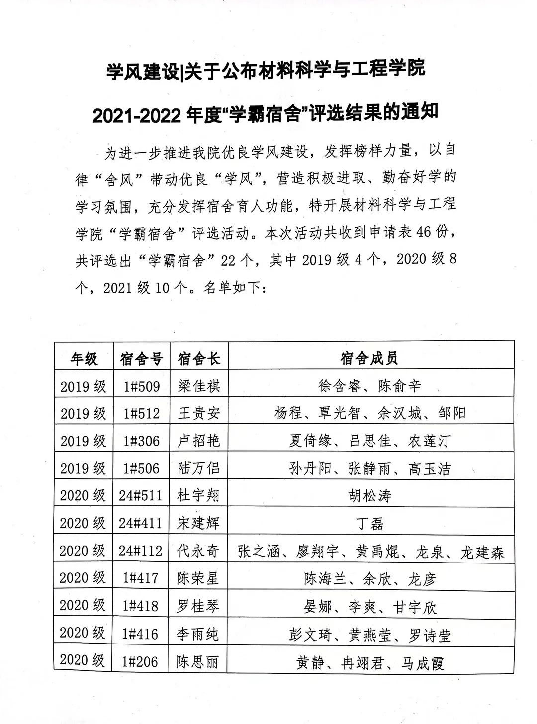 为进一步推进kaiyun体育官网优良学风建设,发挥榜样力量,以自律“舍风”带动优良“学风”,营造积极进取、勤奋好学的学习氛围,充分发挥宿舍育人功能,特开展kaiyun体育官方网站入口登录“学霸宿舍”评选活动。本次活动共收到申请表46份,共评选出“学霸宿舍”22个,其中2019级4个,2020级8个,2021级10个。名单如下: