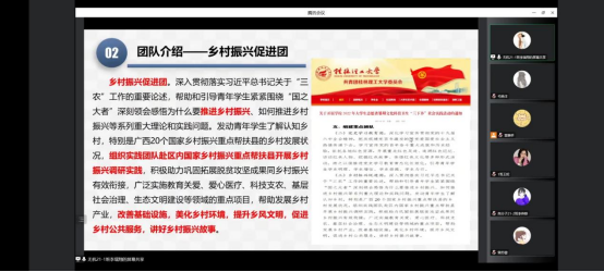 最后,主持人总结了此次分享会。分享会展现了“三下乡”团队的风采和优秀的实践成果,给我们带来了十分宝贵的经验,希望大家能够积极参加社会实践活动,把理论与实践相结合,提高自身综合素质和能力。在二十大精神的领导下,让青春在全面建设社会主义现代化国家的火热实践中绽放绚丽之花。
