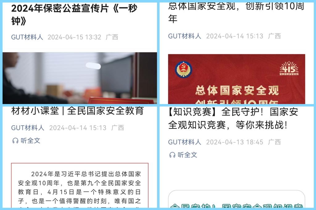 为加强学习效果,学院通过官方网站和官方微信公众号“GUT材料人”推送了《全民国家安全教育》知识小课堂,通过短视频、宣传手册等方式,组织师生学习了解什么是国家安全、怎样维护国家安全,牢记唯有国之安全,方有我之幸福,维护国家安全,人人皆是主角,师生阅读量较高,学习效果良好。